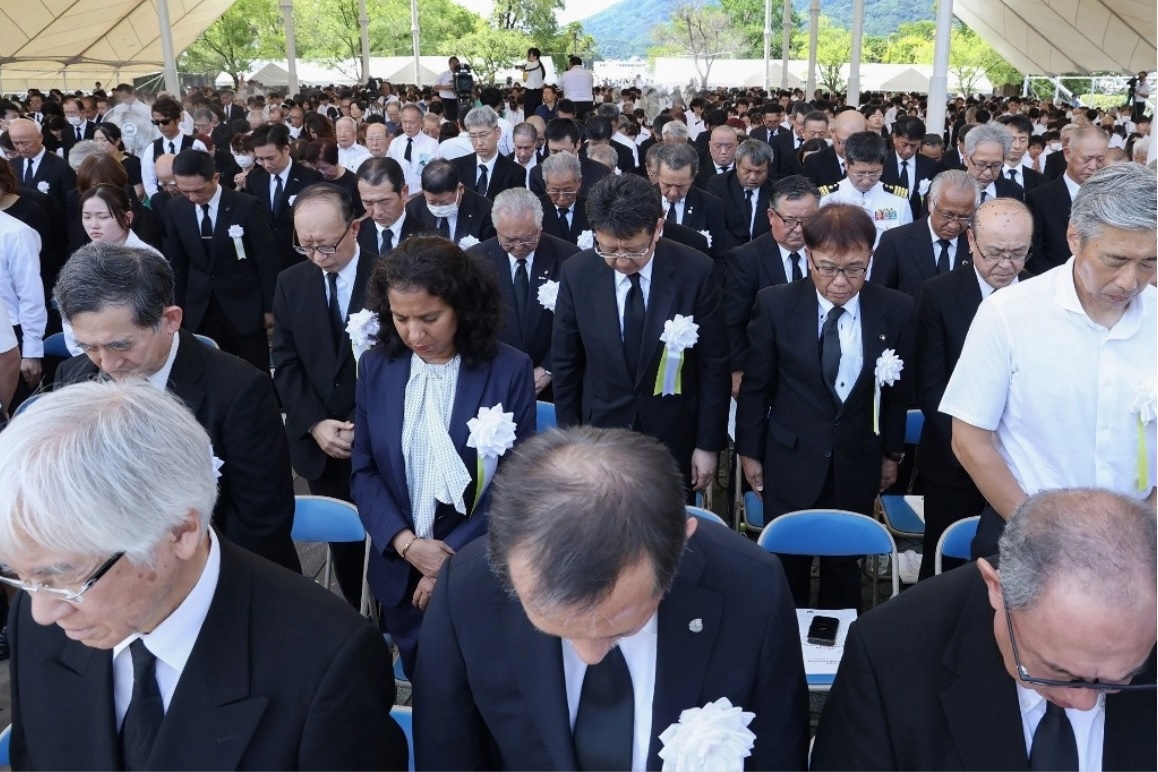 A las 11:02, hora local exacta de la explosión el 9 de agosto de 1945, se guardó un minuto de silencio y, luego, se depositaron ofrendas de flores y agua en memoria de los fallecidos y los sobrevivientes.