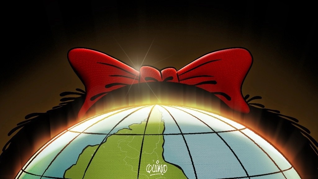 La carta de Campanella agrega: “Pronto ya era uno más de la pandilla de Mafalda. Puedo citar muchos chistes de memoria, pero como hoy enfrento este enorme desafío, no voy a empezar con los spoilers. Corte a: décadas después, en plena producción de Metegol, el maestro Quino vino a visitar nuestra oficina de producción. Había casi 200 artistas de distintas generaciones y para todos nosotros había entrado Dios.