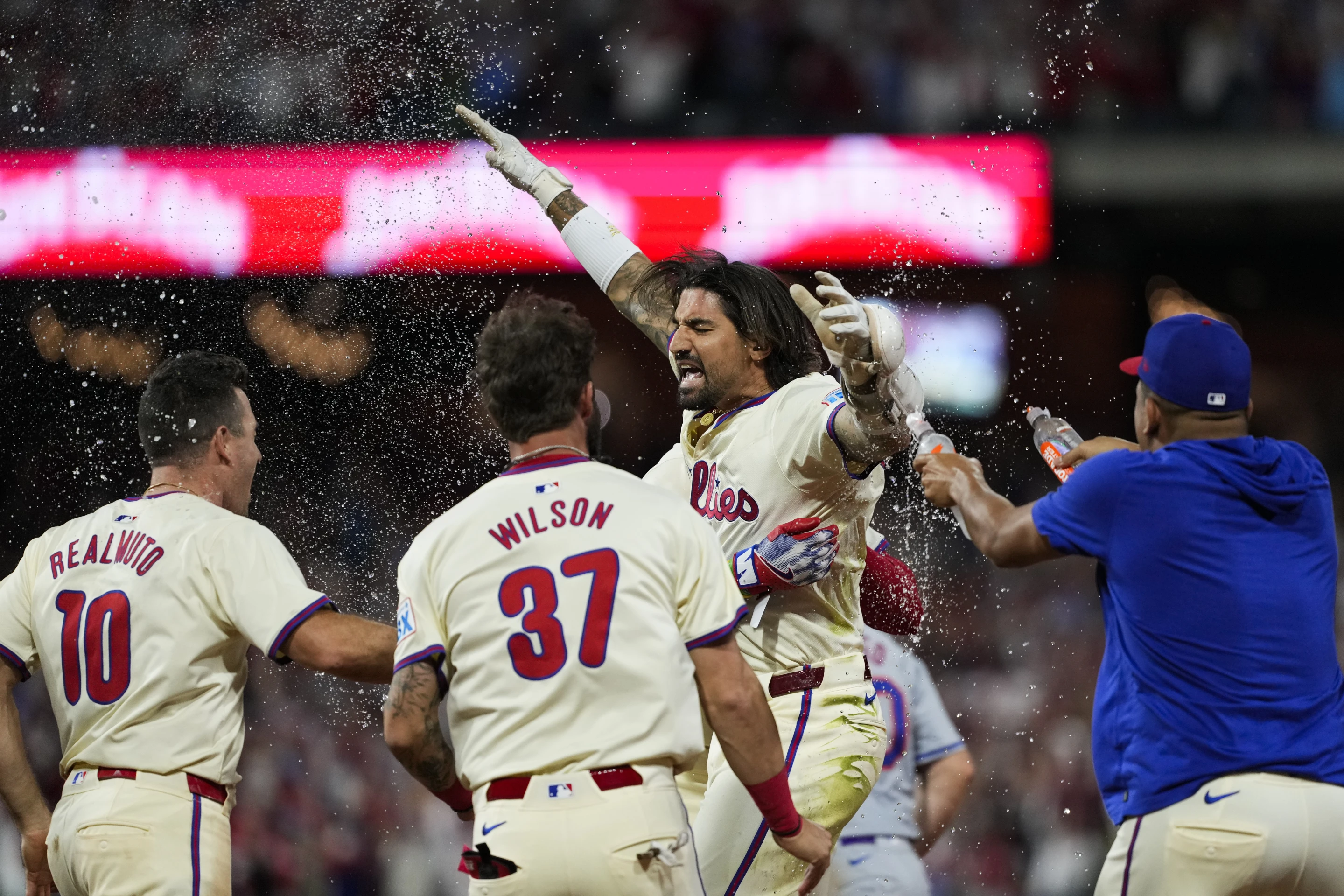 Megill retiró a los primeros dos bateadores de la novena antes de darles pasaportes a Turner (4-2, 2 C) y Bryce Harper, quien también se voló la barda y anotó dos veces. Castellanos -otro que bateó cuádruple-, siguió con el hit que provocó la locura entre la multitud que agitaba toallas en el Citizens Bank Park.