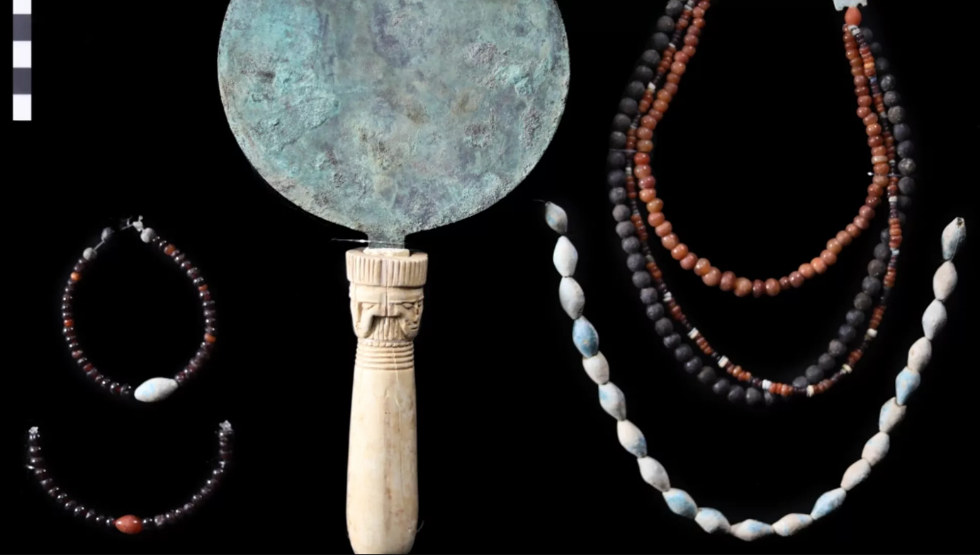 Catherine Blakeney, principal arqueóloga estadunidense de la misión, dijo que descubrieron dos espejos de cobre, uno con un mango en forma de loto y el segundo con un diseño único de Hathor, diosa del cielo, las mujeres, la fertilidad y el amor en el antiguo Egipto.