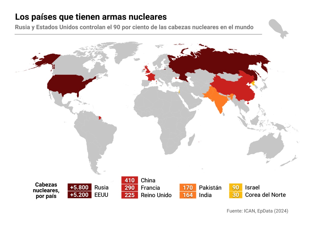 Rusia y Estados Unidos, sin embargo, no son los únicos países que disponen de cabezas nucleares. China figura en tercera posición, con unas 410, según SIPRI, que completa la lista con Francia (290), Reino Unido (225), Pakistán (170), India (164), Israel (90) y Corea del Norte (30).