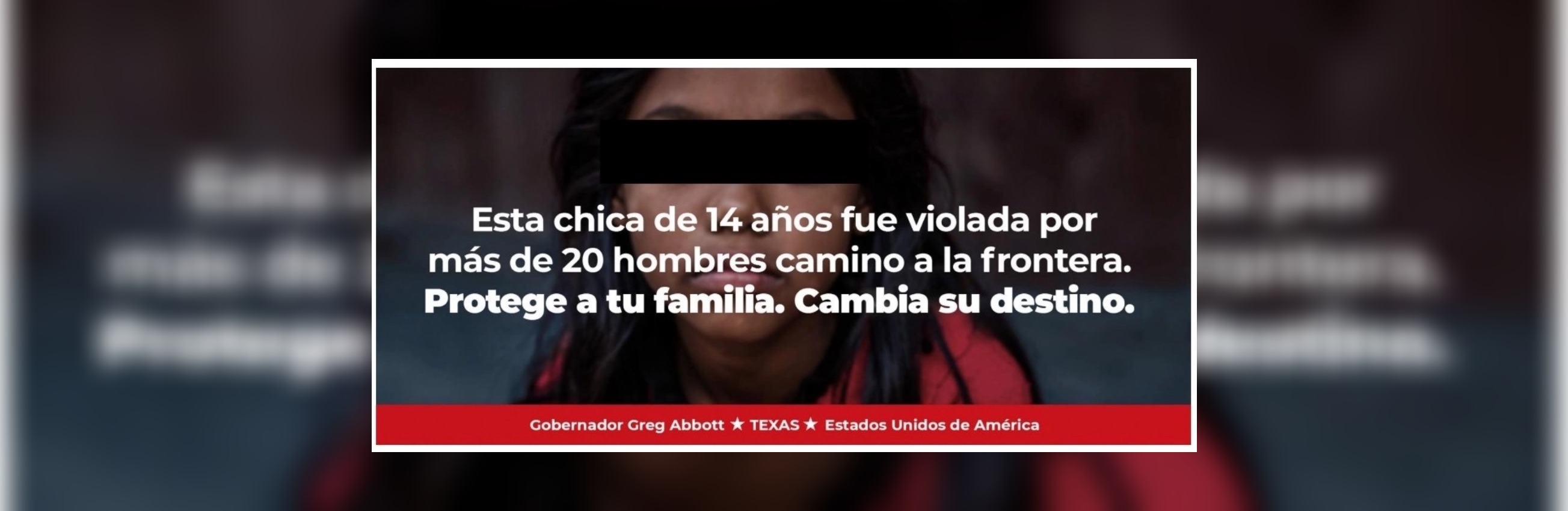 "Tu esposa y tu hija van a pagar el viaje con su cuerpo, los coyotes mienten", o "Si cruzas ilegalmente hacia Texas serás encarcelado", son otras de las advertencias de la campaña anunciada por Abbott durante una conferencia en Wall Ranch, Eagle Pass.