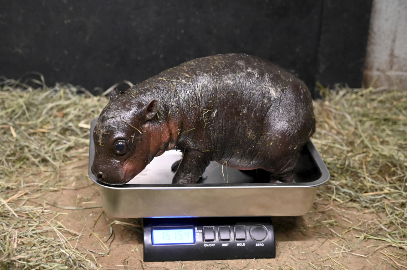 Cinco días después de su nacimiento, la cría fue sometida a un examen neonatal y pesó 15 libras (6,8 kilogramos). Las autoridades dijeron que los hipopótamos pigmeos adultos pueden pesar hasta 600 libras (270 kilogramos).