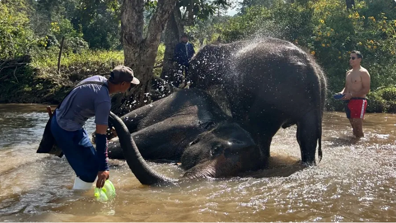 El baño con elefantes que ofrecen algunos centros es una actividad controvertida para atraer turistas en Tailandia, que algunas organizaciones denuncian que entraña riesgos al estresar a animales que pesan más de una tonelada y tienen una altísima sensibilidad.