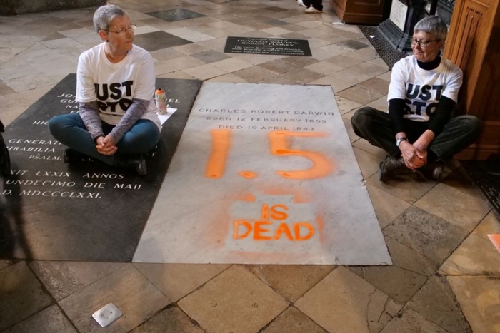 Dos activistas de la organización climática Just Stop Oil realizaron este lunes pintadas sobre la tumba del naturalista británico Charles Darwin, situada en la Abadía de Westminster en Londres.