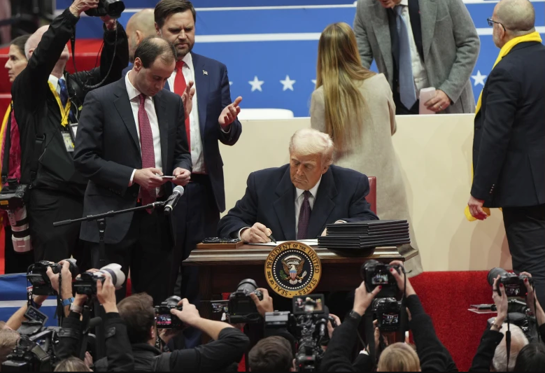El montaje, desde el Capital One Arena, incluyó un pequeño escritorio, una silla y un micrófono, donde Trump se sentó para estampar su firma en las acciones oficiales.