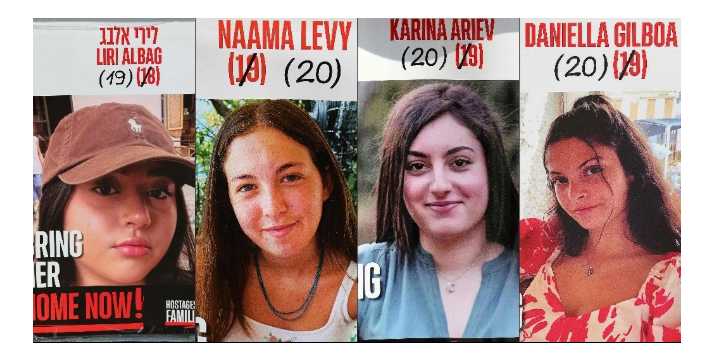 De entre 19 y 20 años, Daniella Gilboa, Karina Ariev, Liri Albag y Naama Levy realizaban su servicio militar en labores de vigilancia cerca de la Franja de Gaza, cuando fueron secuestradas durante el ataque de los islamistas.
