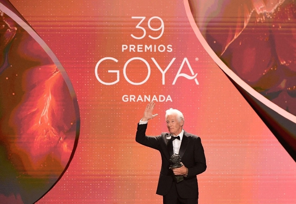 Con el auditorio en pie, Gere recibió de manos de Antonio Banderas el Goya Internacional en reconocimiento a una larga carrera con títulos como Días de gloria, Reto al destino y Mujer bonita.