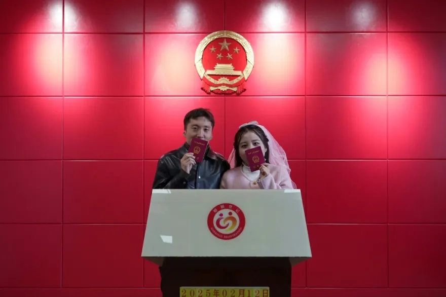 Poco después de registrar su matrimonio, Zhang Gang y Weng Linbin posan frente a un fondo rojo decorado con el emblema del gobierno chino y muestran un fajo de billetes recibido como recompensa por casarse.