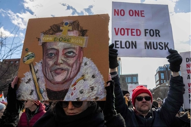 Pancartas denunciaban los despidos de servidores públicos y la retórica derechista del nuevo gobierno, en particular contra Musk -el hombre más rico del planeta- quien está encabezando las iniciativas para desmantelar o reducir partes del gobierno federal (incluyendo algunas que están investigando o imponiendo castigos contra algunas de las empresas del magnate por diversas violaciones).