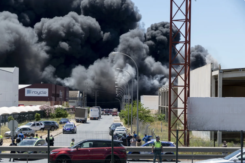 Un espectacular incendio en una nave de distribución de productos químicos de un polígono cercano a Sevilla, en el sur de España, generó una gran nube negra que llevó a las autoridades a pedir a casi 80 mil vecinos que permanezcan en sus casas con puertas y ventanas cerradas.