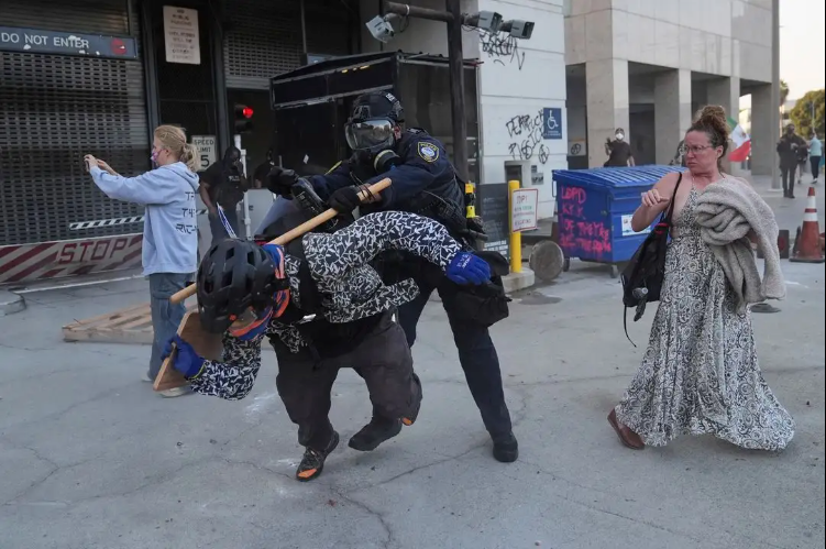Al menos un manifestante cayó al suelo al intentar impedir que una camioneta de las fuerzas del orden se llevara a los detenidos, según mostraron las imágenes aéreas de la televisora KTLA.