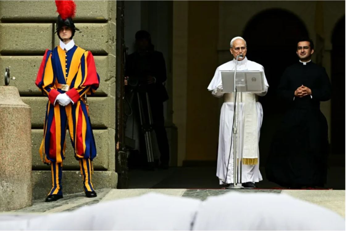 "Me alegra estar entre ustedes (…) y les agradezco a todos su cálida bienvenida", declaró el papa, de pie frente a las puertas del Palacio Apostólico, flanqueado por dos guardias suizos con uniforme de gala.