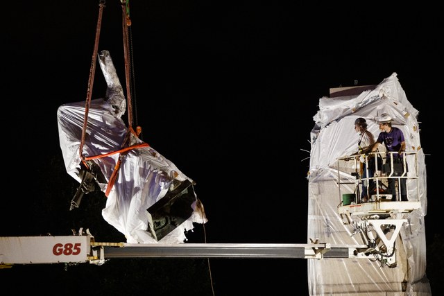 Los operarios emplearon una grúa muy grande para bajar una de las estatuas de su pedestal del parque Grant, en el centro de Chicago. Una pequeña multitud vitoreó y los autos que pasaban tocaban sus bocinas mientras la estatua era retirada alrededor de las 3 horas. La segunda estatua fue retirada alrededor de las 5:30 horas del parque Arrigo, en el barrio de la Pequeña Italia de Chicago.