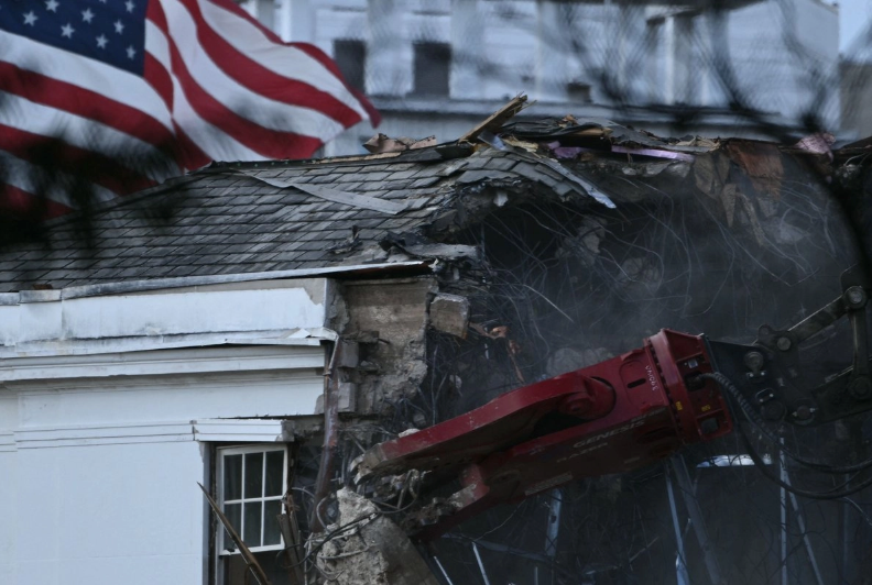 Los trabajos de demolición del ala este comenzaron el lunes, una imagen impactante para muchos estadunidenses que rápidamente generó una ola de memes en redes sociales —entre ellos, uno que muestra a Trump montado en una bola de demolición dorada.