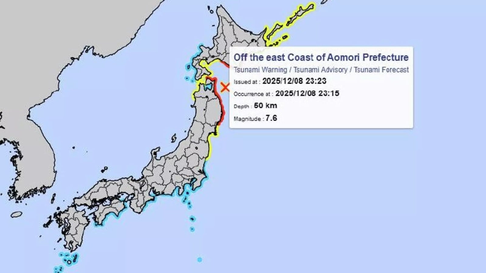 La JMA activó una alerta de tsunami de hasta tres metros de altura para las costas de la prefectura de Aomori, la vecina Iwate y la punta sur de la isla de Hokkaido, la más septentrional del archipiélago.