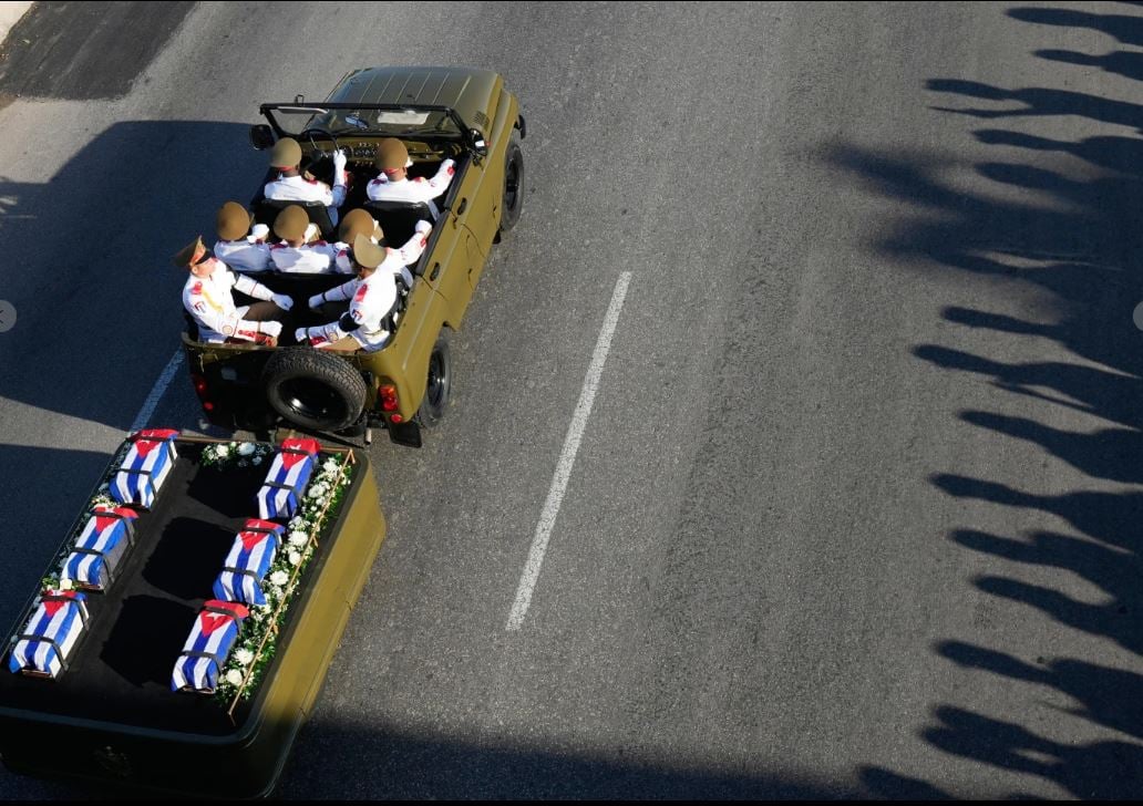 Los restos de los 32 militares cubanos fueron trasladados en seis vehículos desde el aeropuerto hasta la sede del ministerio de las Fuerzas Armadas Revolucionarias, cerca de la emblemática Plaza de la Revolución, donde los habitantes de la capital podrán rendirles homenaje a lo largo del día.