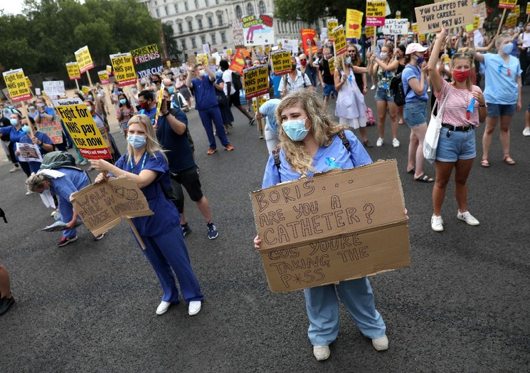 Los trabajadores médicos han sido aclamados como héroes durante la pandemia, tanto por el gobierno como por la gente, pero algunos dicen que una década de recortes en el gasto público por parte de Johnson y anteriores primeros ministros conservadores ha dejado en muy mal estado al Servicio Nacional de Salud, que es financiado por el estado.