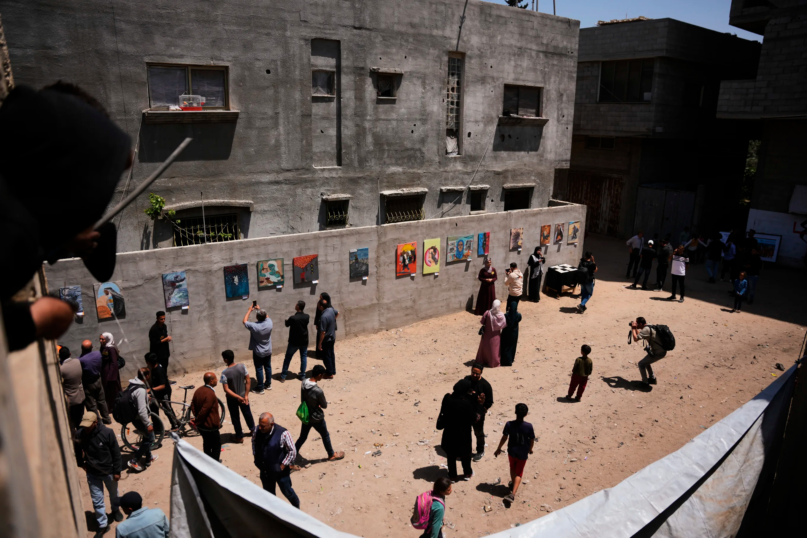 Jóvenes artistas palestinos en Gaza montaron una exposición improvisada el martes, en busca de otra manera de mostrarle al mundo lo que ha ocurrido durante la guerra y el frágil alto al fuego.