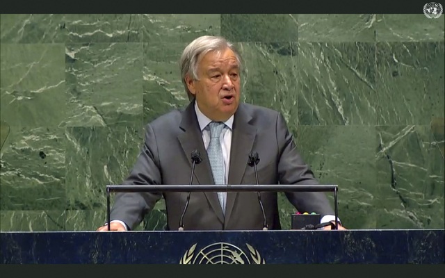 El jefe de la ONU pronunció su discurso en el vasto Salón de la Asamblea General, donde sólo se permitió la entrada a un diplomático con mascarilla de cada una de las 193 naciones miembros de la ONU, esparcidos en la cámara.