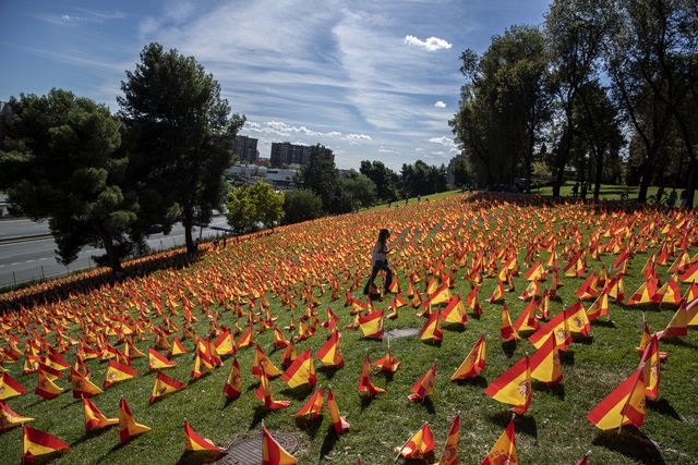 Una asociación de familias de víctimas del nuevo coronavirus dijo el domingo que plantó 53 mil banderitas españolas en un parque de Madrid en honor a los muertos por la pandemia.