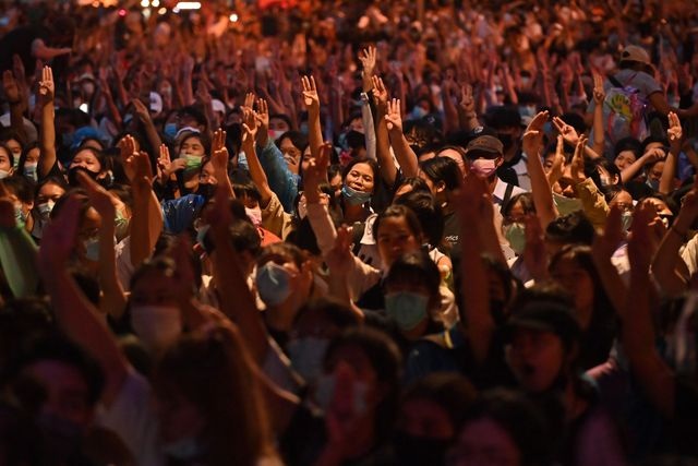 El miércoles, un coche con la reina Suthida a bordo, que según las autoridades no podía evitar el recorrido de una gran manifestación prodemocracia en Bangkok, se detuvo unos instantes y decenas de manifestantes levantaron tres dedos de la mano delante de su vehículo, una señal de resistencia inspirada en la película Los juegos del hambre y un gesto de desafío a la autoridad real.