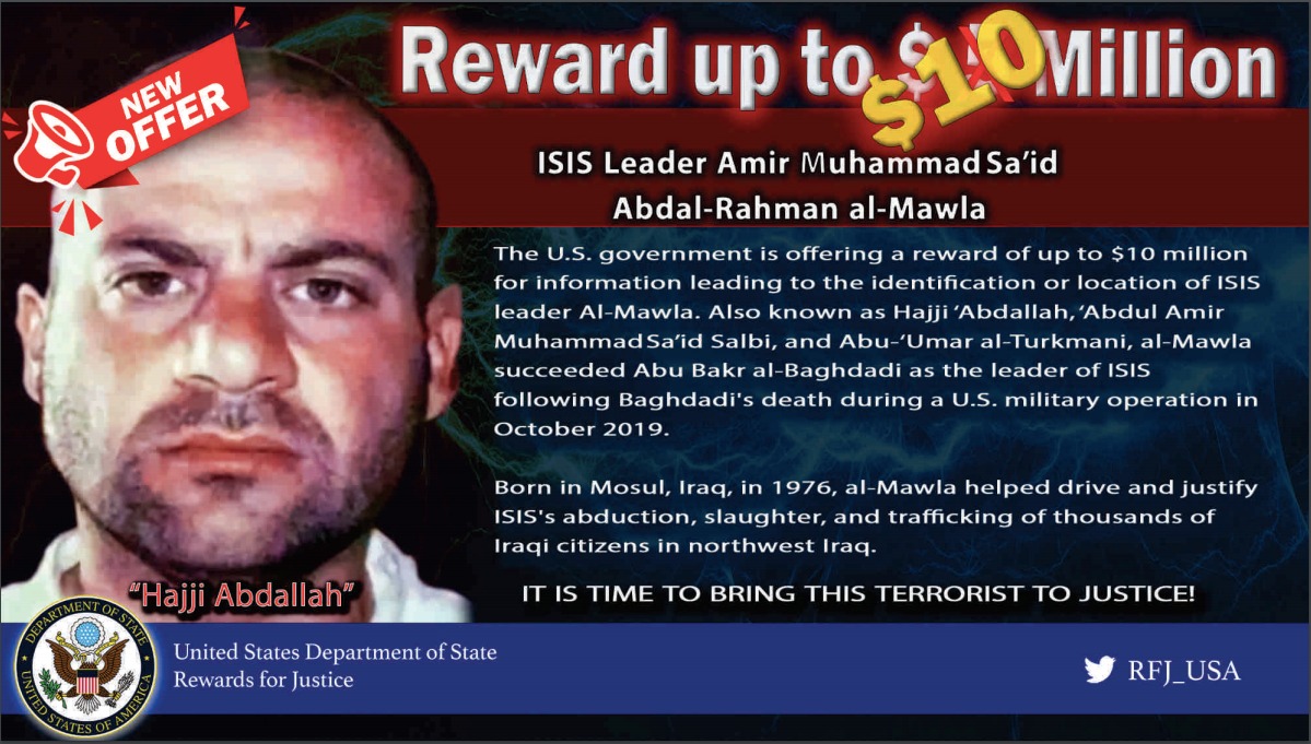 Sobre Al Mawla ya pesaba una recompensa estadunidense de 5 millones de dólares por su papel en el secuestro, asesinato y tráfico de mujeres yazidíes en el noroeste de Irak. Dicha remuneración fue elevada a 10 millones en marzo cuando Washington llegó a la conclusión de que Al Mawla era el nuevo líder del EI. Pese al aumento, la nueva suma dista mucho de los 25 millones ofrecidos a cambio de cualquier información sobre el ex califa Al Baghdadi.