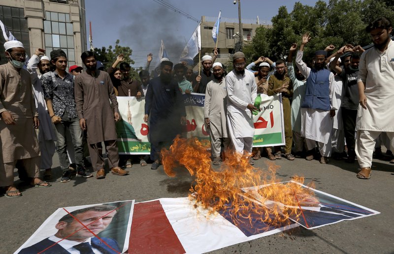 Las protestas coinciden con el aumento de las tensiones entre Francia y los países de mayoría musulmana, que surgieron a principios de mes cuando un joven musulmán decapitó a un maestro de escuela francés que mostró caricaturas del profeta Mahoma en clase.