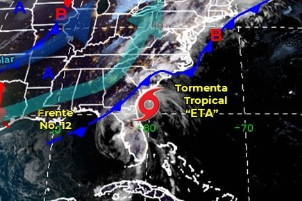 Horas antes, Eta tocó tierra cerca de Cedar Key, Florida, para después avanzar hacia el noreste a través del estado, de acuerdo con el Servicio Nacional de Meteorología en Miami. La tormenta salió hacia el Atlántico el jueves por la tarde y se pronostica que pasará justo frente a la costa de Carolina del Sur y Carolina del Norte mientras avanza hacia el norte por el litoral del sureste hasta el viernes por la mañana.