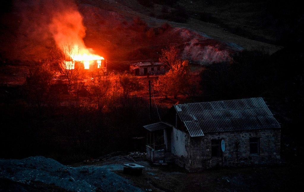 El sábado por la mañana en el pueblo de Charektar, que marca el límite con el distrito vecino de Martakert, que quedará bajo control armenio, ardían al menos seis viviendas.