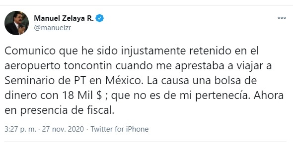 "Comunico que he sido injustamente retenido en el aeropuerto Toncontín cuando me aprestaba a viajar a seminario del PT (Partido del Trabajo) en México", escribió Zelaya en su cuenta de Twitter.