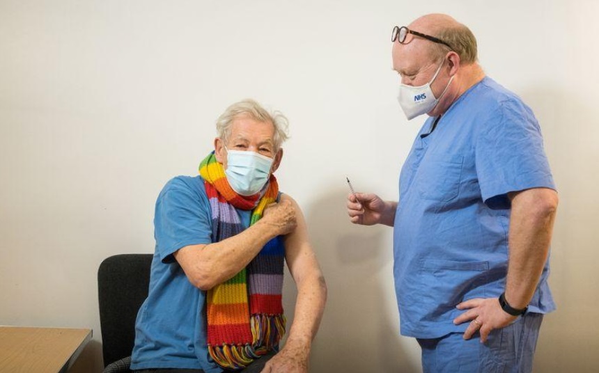 El estatal Servicio Nacional de Salud (NHS, por su sigla en inglés), que está llevando adelante el programa masivo de vacunación de COVID en Gran Bretaña, publicó varias fotos de McKellen, vestido con una camiseta azul y una bufanda a rayas con los colores del arco iris, subiendo el pulgar al recibir la inyección.