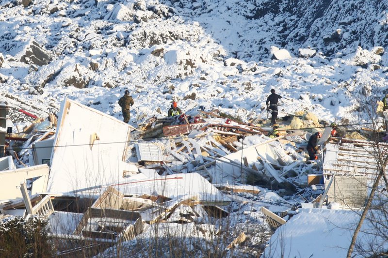 Equipos de búsqueda patrullan con perros mientras helicópteros y drones con cámaras de detección de calor sobrevuelan la ladera devastada en Ask, una aldea de 5 mil habitantes que sufrió el peor deslave en la historia moderna de Noruega. Al menos mil personas fueron evacuadas.