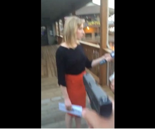 Es evidente que nadie se da cuenta de su presencia, ya que el camarógrafo está de espaldas y la periodista está concentrada en la entrevista.