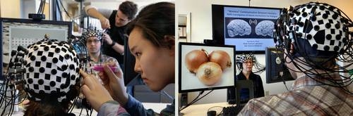 Para el experimento, los dos investigadores se colocaron cascos con 64 cables cada uno que caían hacia atrás a modo de trenzas. En el extremo de la mitad de esos cables de fibra óptica, débiles rayos láser penetraban el cráneo hasta unos dos centímetros y medio del cerebro. Allí rebotaban en la sangre y emitían reflejos recogidos por la otra mitad de cables.