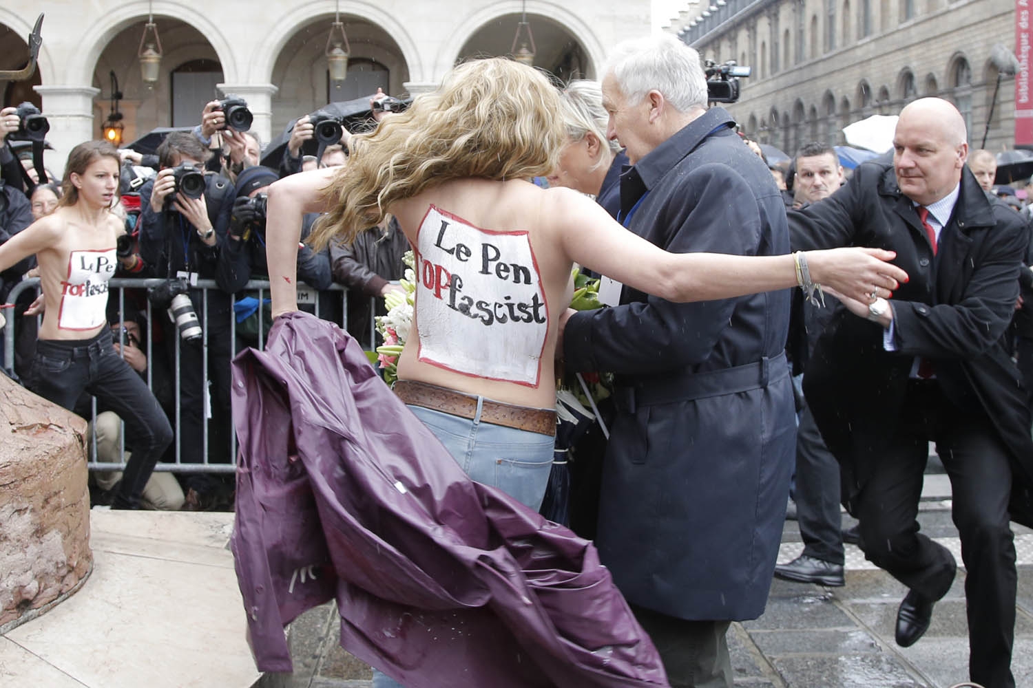 Tres mujeres del movimiento feminista Femen, con el torso desnudo, interrumpieron un discurso por el Día Internacional del Trabajo pronunciado por la lideresa del partido francés de extrema derecha Frente Nacional, Marine Le Pen, haciendo un saludo nazi, mientras en el resto de Europa, África y Asia se realizaron marchas para plantear las tradicionales demandas laborales y exigir la paz mundial.