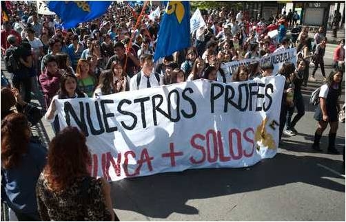 Por una educación gratuita y de calidad ahora, era una de las consignas que exhibieron en carteles los manifestantes que marcharon por la céntrica avenida de la Alameda, en una movilización que transcurrió sin incidentes y con el resguardo de cientos de policías.