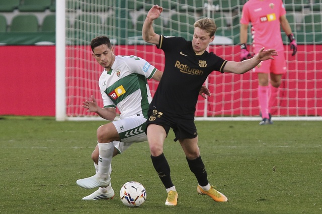 Frenkie de Jong abrió el marcador a los 39 minutos y habilitó a Riqui Puig para la sentencia a los 89, con lo que el conjunto catalán sacó el domingo una apurada victoria 2-0 como visitante ante el Elche y retomar el tercer puesto de la Liga española.