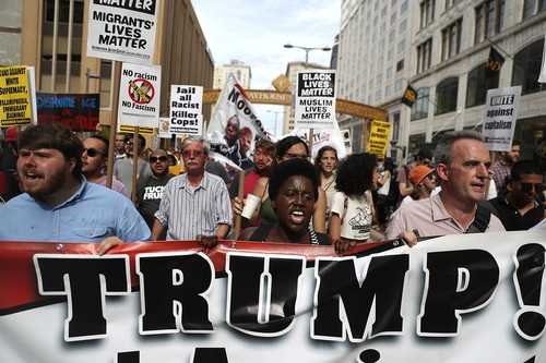 Desde ayer comenzaron las protestas en el centro de esta ciudad. Unos 100 activistas antiTrump coreaban:"De México a Palestina, estos muros fronterizos tienen que caer", y "No a Trump, no a un Estados Unidos fascista".
