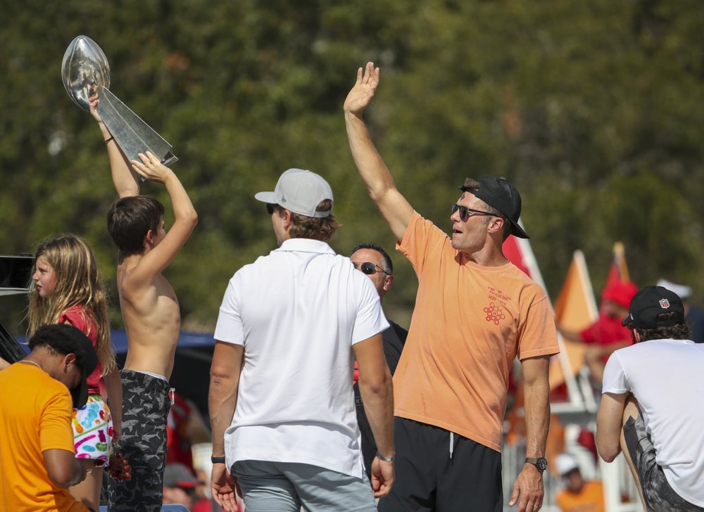 En cierto momento, fue posible ver a Brady en un video, en el que lanzaba el trofeo Vince Lombardi desde su bote a Cameron Brate, quien no llevaba camiseta y viajaba en otra embarcación. El desplante provocó ovaciones de los aficionados y jugadores.