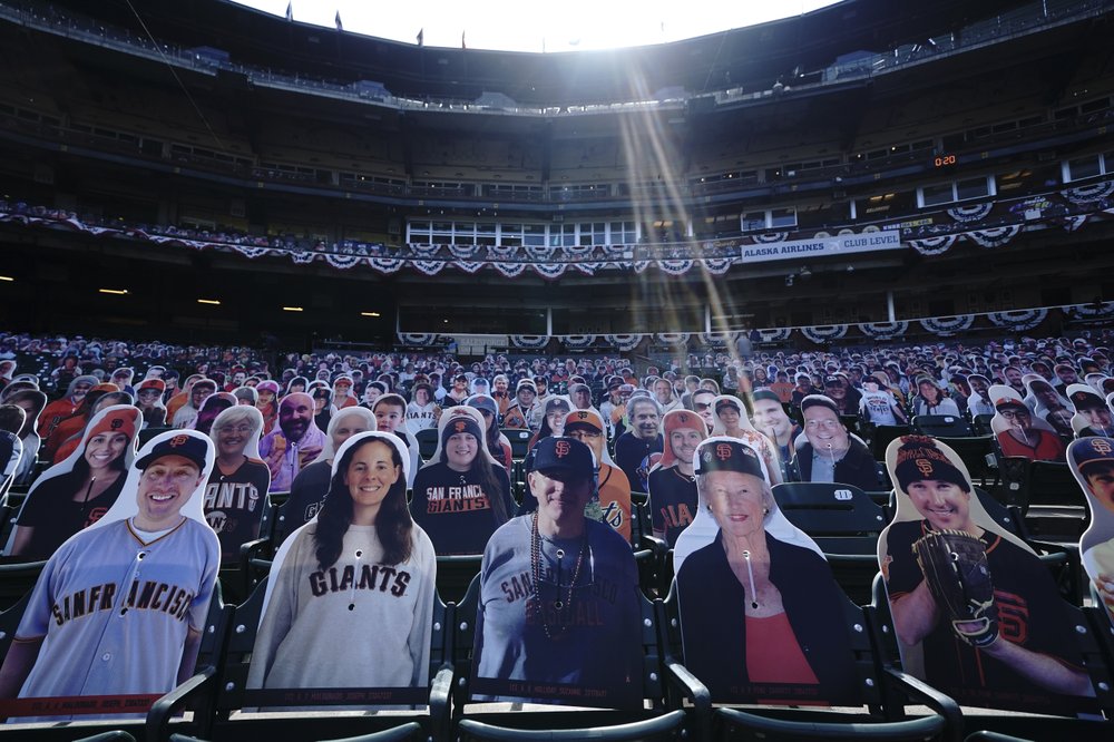El martes 28 de julio de 2020, figuras de cartón de aficionados aparecen sentadas en el Oracle Park, antes de un juego de beisbol entre Gigantes y Padres de San Diego, en San Francisco. Fue una postal recurrente en parques de las Mayores. Sonidos falsos simularon aplausos o gritos. A veces funcionó. A veces no.
