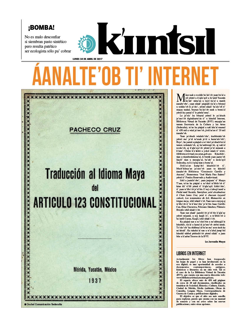 Le je’ela’ ku béeytal yéetel le ya’abach ju’uno’ob digitalizarta’an ti’ u kúuchil Internet, Biblioteca Virtual de Yucatán (BVY) meyajta’an tumen Secretaría de la Cultura y las Artes (Sedeculta), tu’ux ku páajtal u xak’alta’al maanal ti’ 450 mil u wáal ju’uno’ob, jóok’sa’an ti’ 20 mil áanalte’ob.