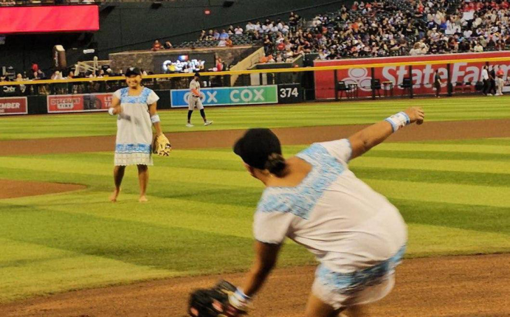 En español: Amazonas de Yaxunah lanzan primera bola en partido de las Grandes Ligas: Arizona vs San Francisco