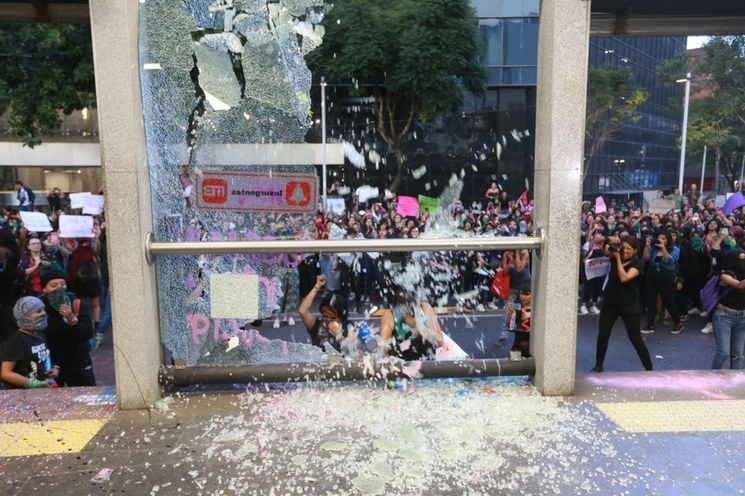 Como parte de la protesta vandalizaron unidades del Metrobús que quedaron atrapadas sobre la Glorieta.