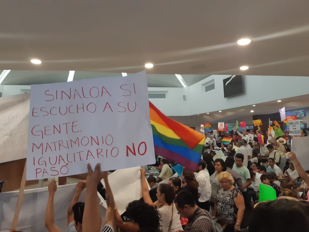 En una sala de sesiones abarrotada por manifestantes de la comunidad lésbico, gay, bisexual y transgénero (LGBT) y de grupos religiosos identificados con la “familia natural” que pasaron por un filtro de seguridad para poder ingresar, se llevó a cabo la sesión que en último punto del orden del día puso a consideración la segunda lectura del dictamen de la Comisión de Puntos Constitucionales y de Justicia a favor del matrimonio igualitario.