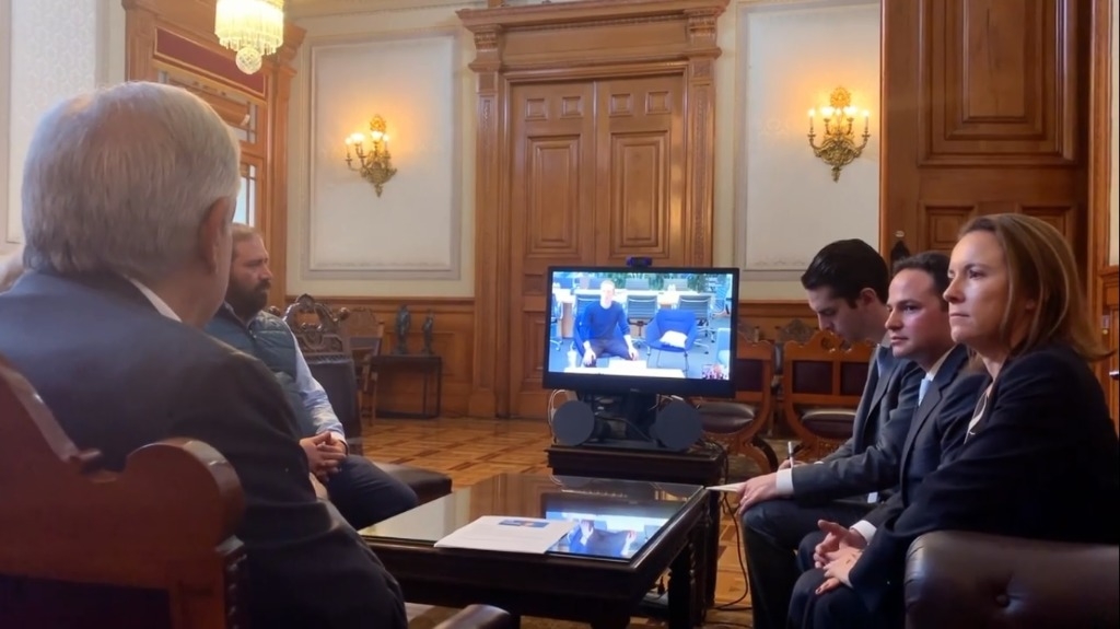 En su despacho de Palacio Nacional, el Presidente estuvo acompañado por Raymundo Artis Espriú, coordinador de Estrategia Digital Nacional, y Emiliano Calderón, coordinador nacional de Tecnología, así como de tres representantes de Facebook México-Centroamérica.