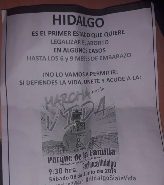 “Hidalgo es el primer estado que quiere legalizar el aborto” dicen los volantes en los que se convoca a la feligresía a participar en la Marcha por la Vida que partirá del Parque de la Familia de Pachuca a las 9:30 horas de la mañana del sábado 8 de junio.