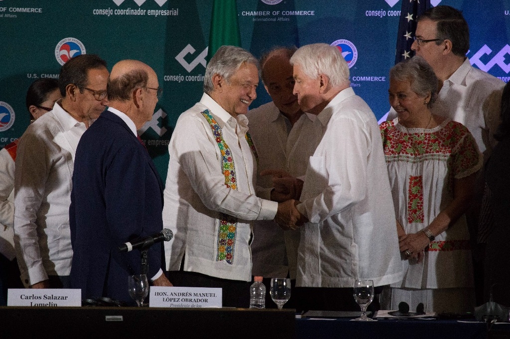 En el marco de la clausura del XI diálogo del gobierno de México con los directores generales de empresas estadunidenses con inversiones en Mexico, ante el presidente Andres Manuel López Obrador, Donahue destacó que preservar la relación vital méxico-estadunidense es una prioridad de la Cámara. Por eso, aseveró, los aranceles impuestos al acero y al aluminio deben ser retirados antes de que se apruebe el tratado comercial para América del Norte.