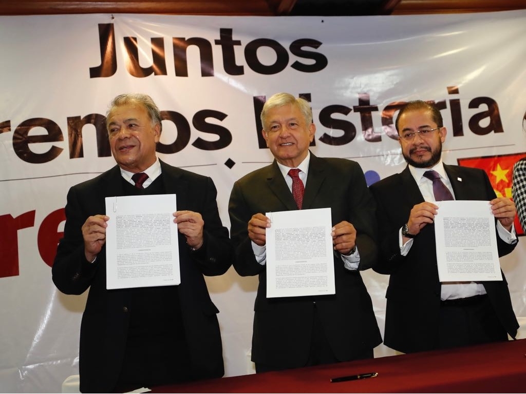 Firmaron el convenio López Obrador, por Morena; Alberto Anaya, por el PT y Erick Flores, del PES.