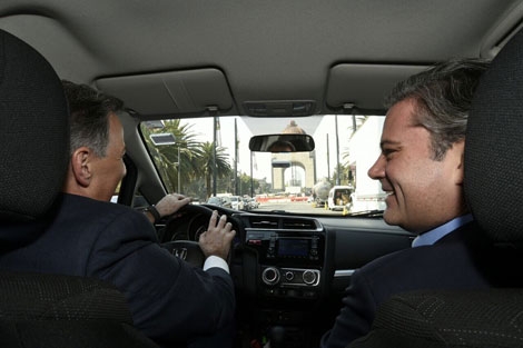El precandidato único del PRI al volante y el secretario de Educación, en el asiento del copiloto, sonriendo. Al fondo se ve el Monumento a la Revolución y, en otra toma, las inmediaciones de la sede nacional de ese partido.